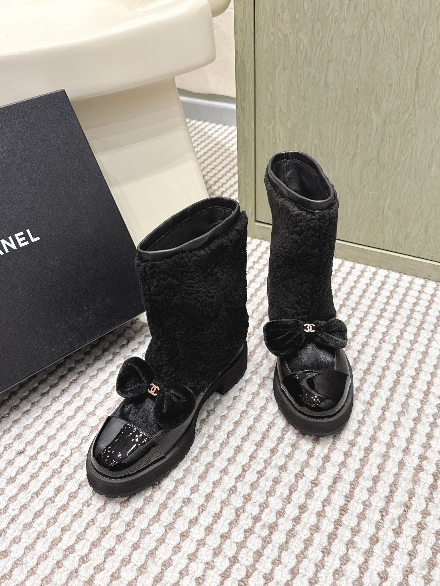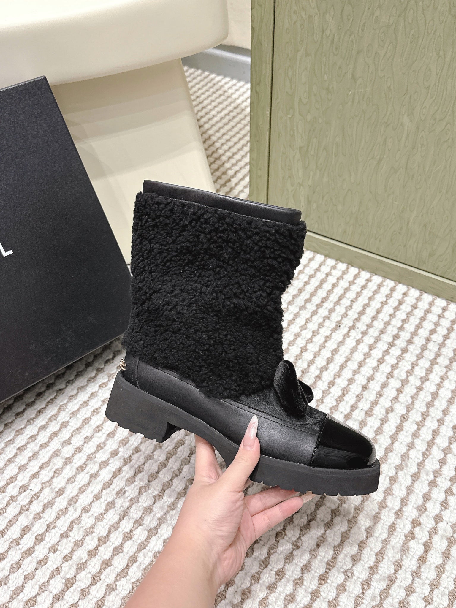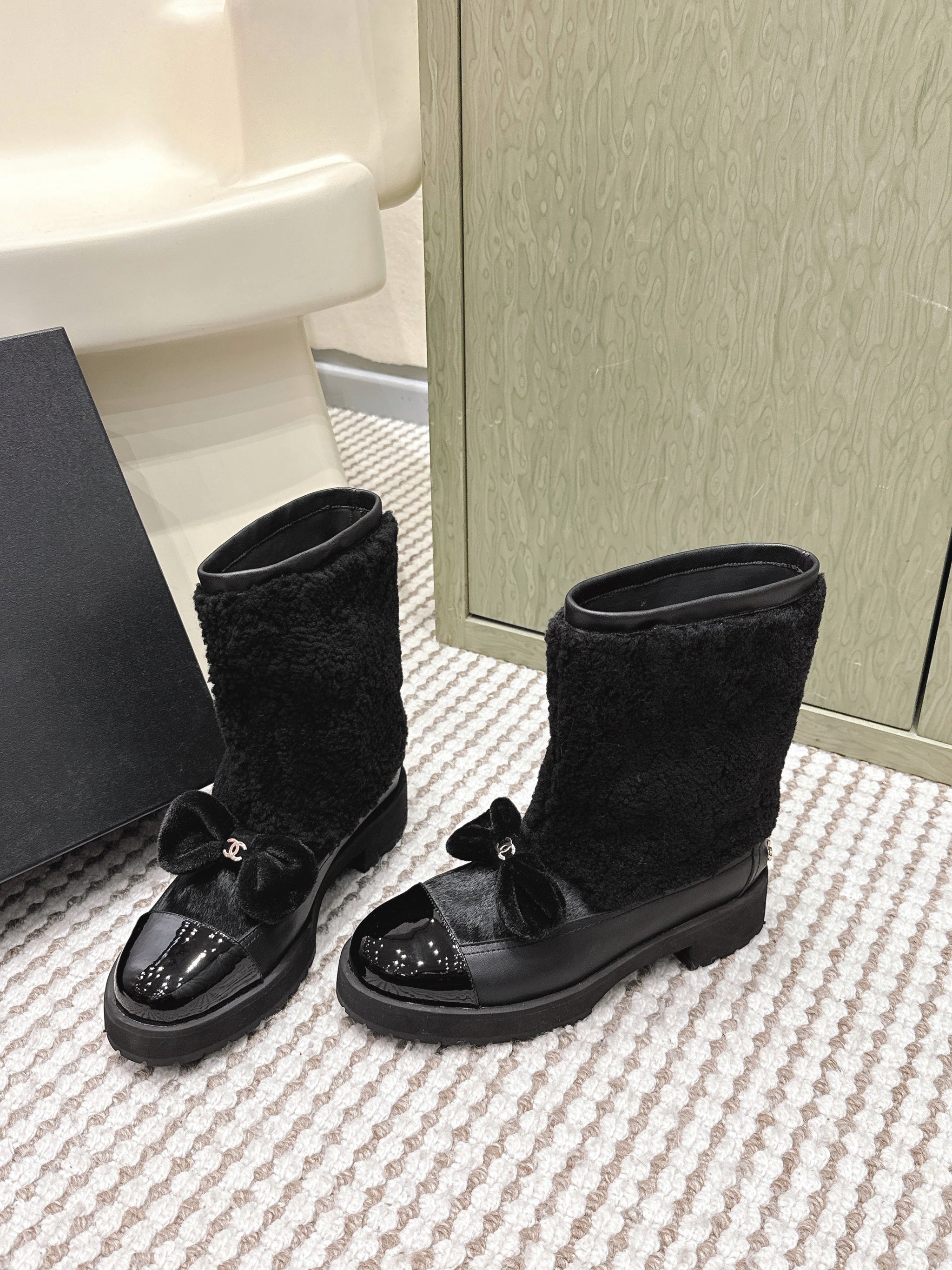 CHANEL 25S ANKLE BOOTS IN BLACK SHEARLING LAMBSKIN AND PATENT CALFSKIN