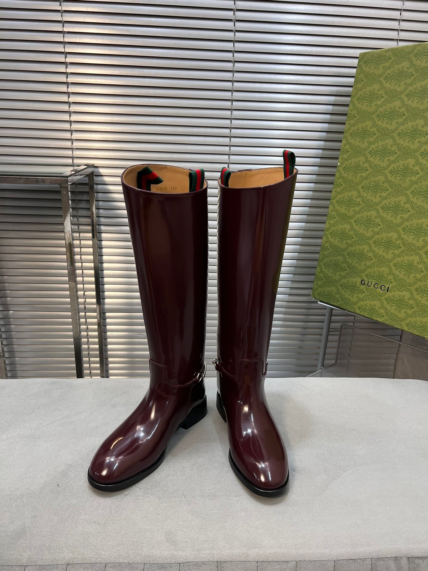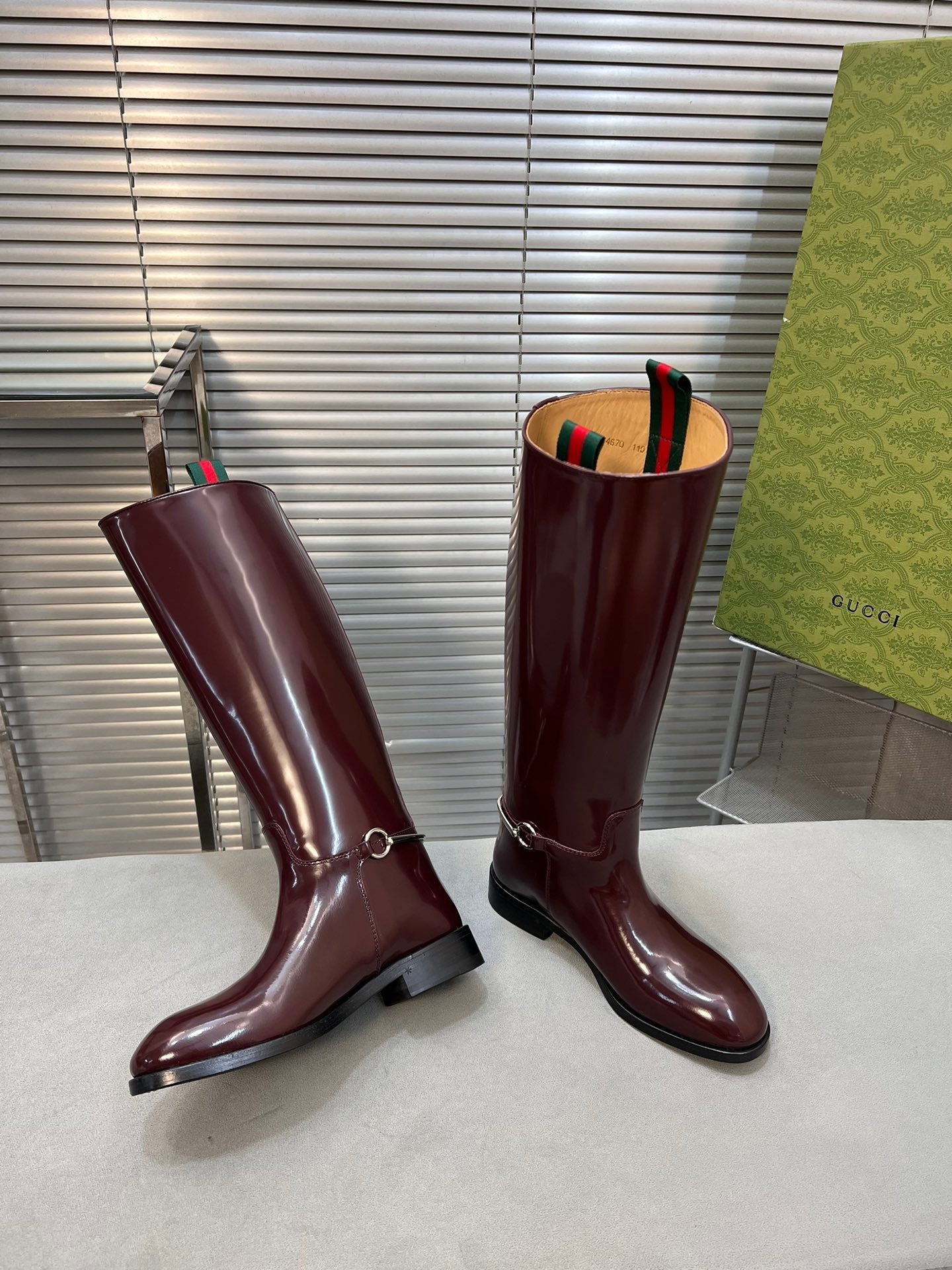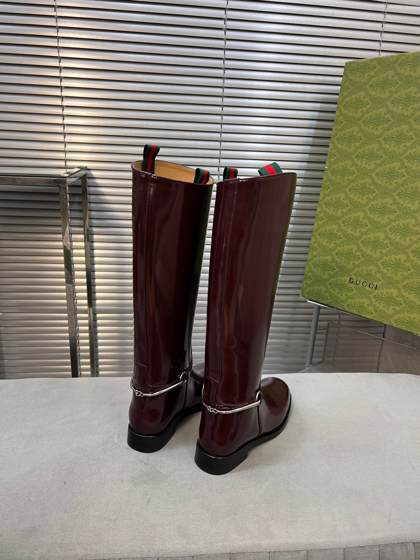 SLIM HORSEBIT KNEE BOOTS WITH WEB IN WINE RED GLOSSY CALFSKIN