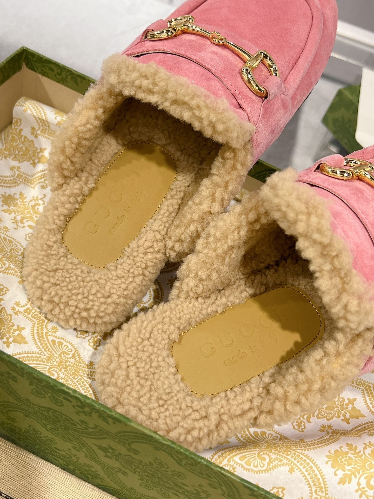 HORSEBIT MULE IN SALMON PINK SUEDE AND FLEECE LINING