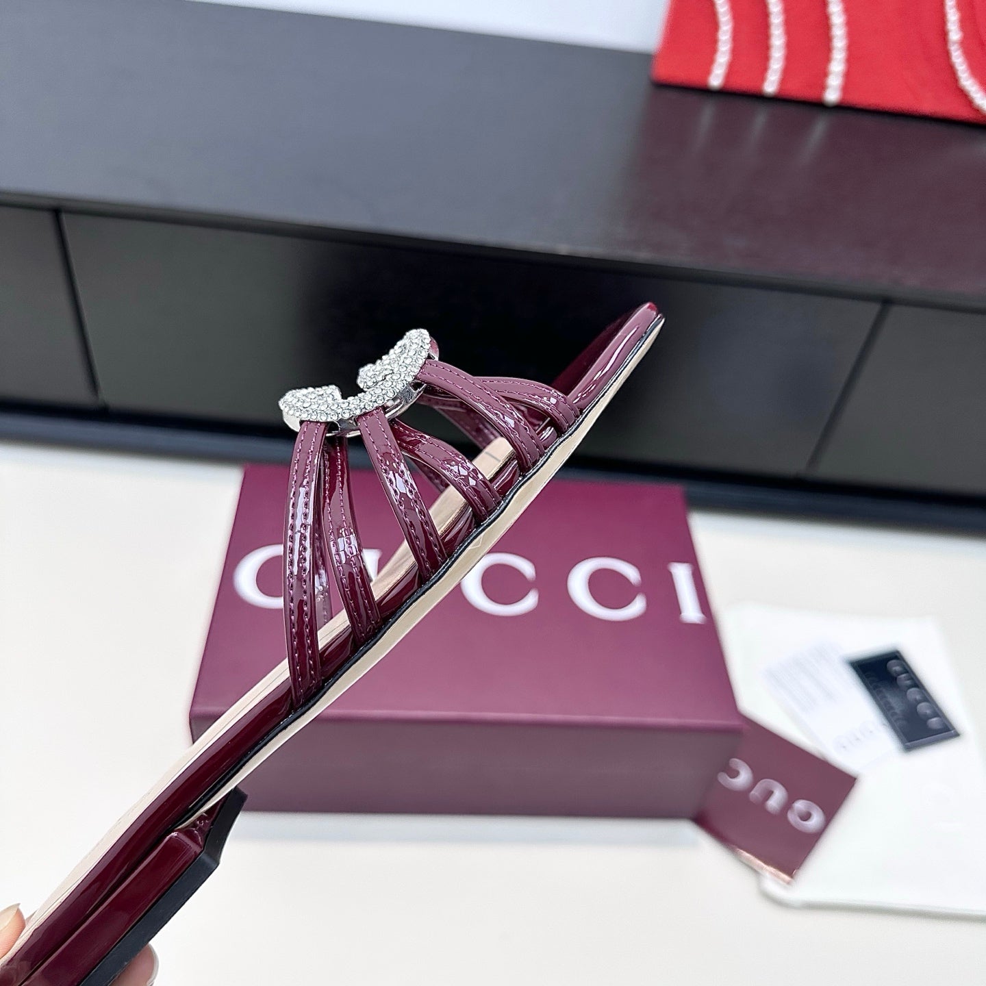 GUCCI 26S FLAT SLIDES IN DARK RED CALFSKIN WITH CRYSTAL