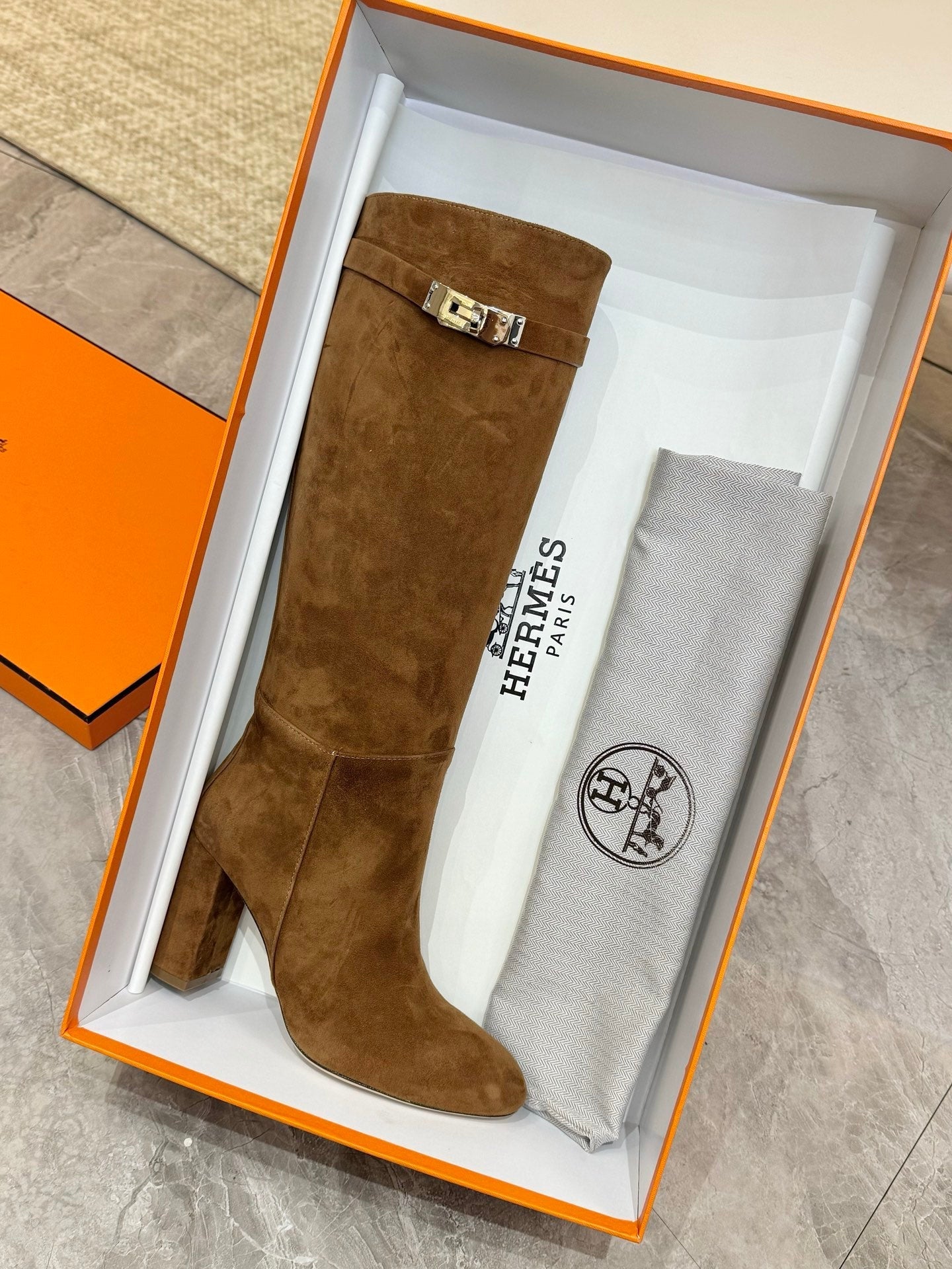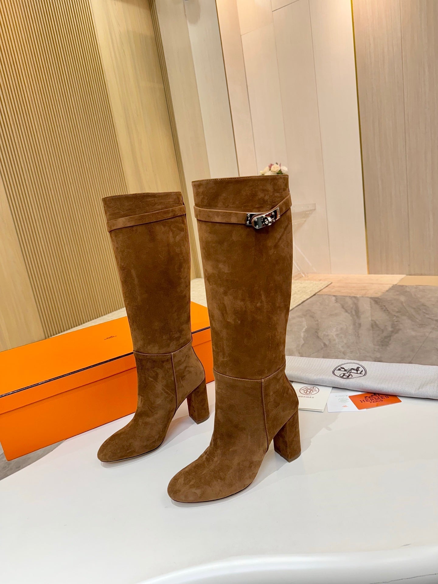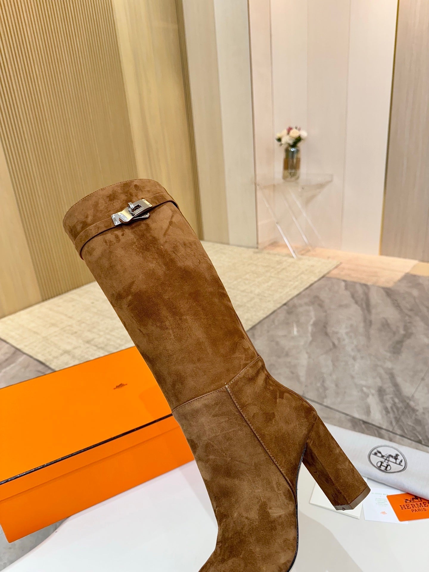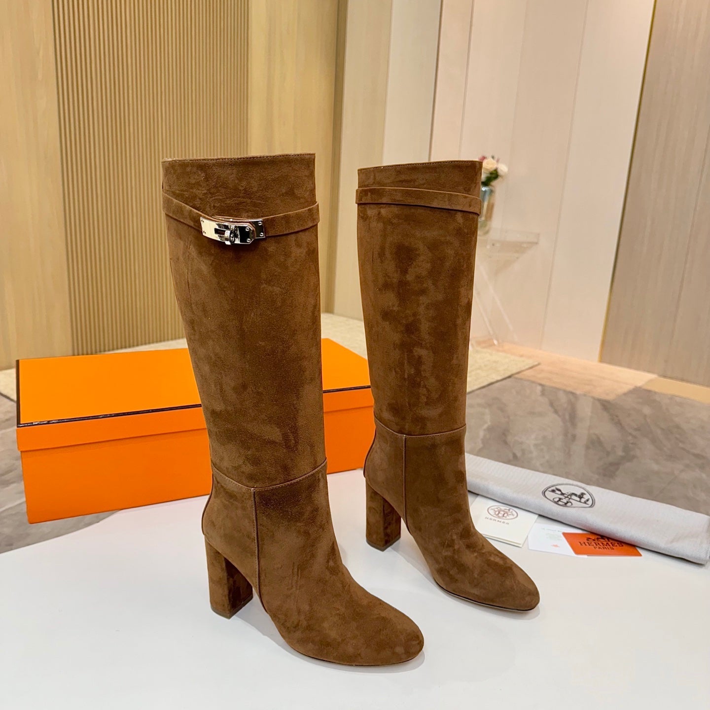 HM 25S KELLY KNEE-HIGH BOOTS IN BROWN SUEDE WITH SILVER HARDWARE
