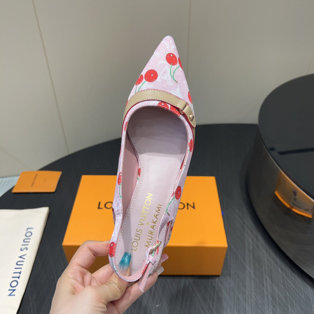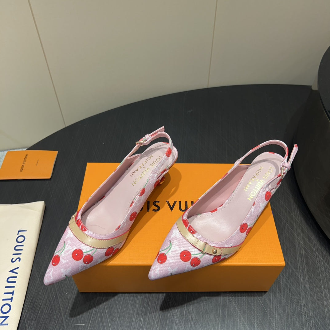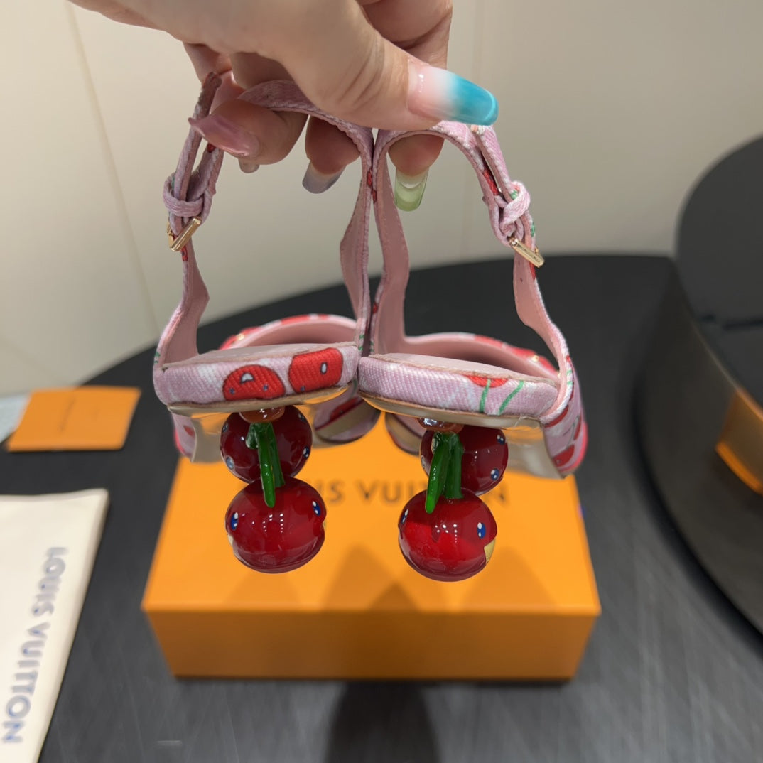 LV HIGH SLINGBACK LOGO AND CHERRY PRINT 25S 55MM IN LIGHT PINK DENIM